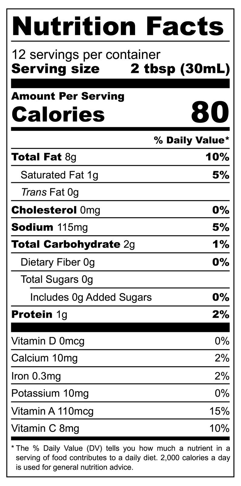 INGREDIENTS: Expeller Pressed Organic Avocado Oil, Garlic Chives, Apple Cider Vinegar, Garlic, Calamondin Juice, Dijon Mustard (Water, Mustard Seeds, Vinegar, Salt), Lemon Juice, Calamondin Peel, Lemon Peel, Orange Juice, Salt, Pepper.